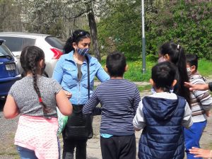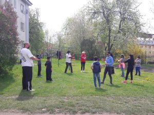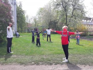 Začíná schůzka s dětmi – zaujmout a zapojit děti je klíčové, samy potom přesvědčí a poučí dospělé i vrstevníky a začnou se chovat bezpečněji. Skupinka se rozestavuje do kruhu, všichni rozpřáhnou ruce a točí se dokola – jednoduše si tím vytvoří bezpečný odstup 2 metry od ostatních. Okolo postávají dospělí – pracovníci i je upozorňují na dodržování odstupu. Prvním bodem programu je rozcvička – děti i pracovníci se protahují, je vidět, že ztuhlé svaly bolí, ozývá se pofňukávání.